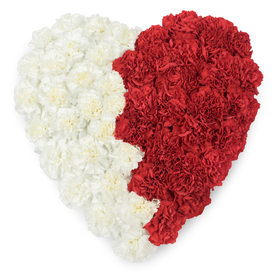 Our stunning heart-shaped arrangement features a captivating mix of white and red carnations, designed to convey love and sympathy. Each flower is meticulously selected for maximum freshness.