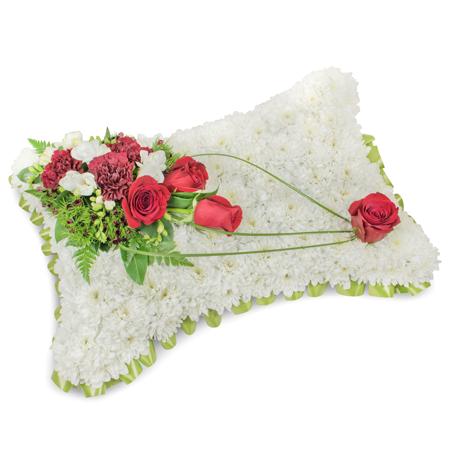 Convey your deepest sympathies with our graceful condolence flower arrangement, meticulously crafted to offer solace and beauty. This unique bouquet features a stunning assortment of white chrysanthemums, red roses, white freesias, dark red carnations, dianthus, and bear grass, arranged to perfection.